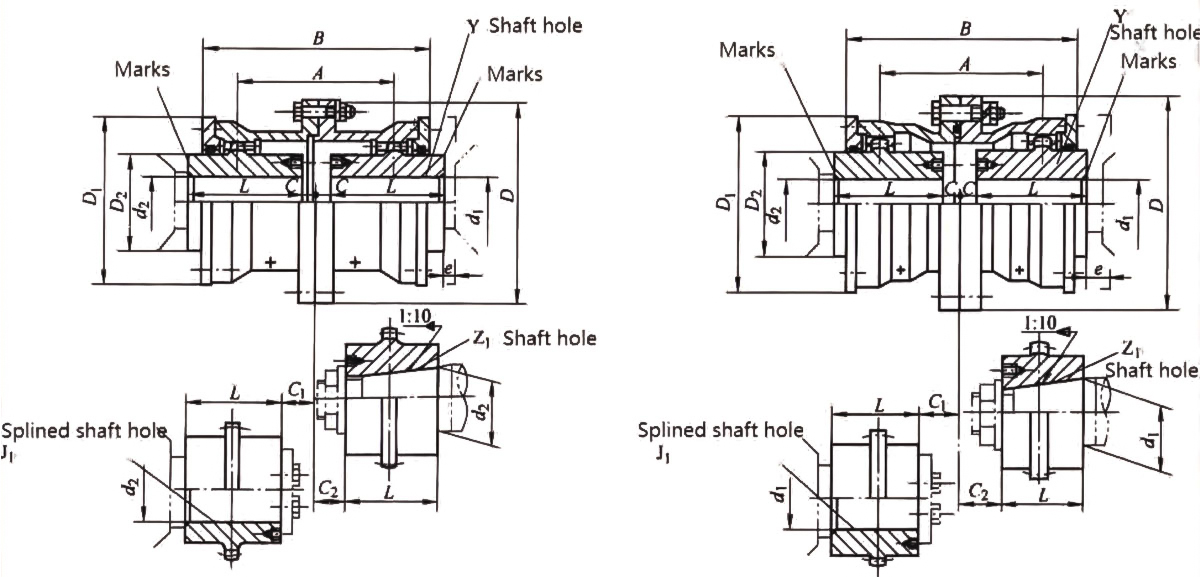 Die GA-Trommelgetriebekupplung ist eine Art flexible Kupplung, die dazu dient, Drehmoment zwischen zwei Wellen zu übertragen und gleichzeitig Fehlausrichtungen und Wellenendbewegungen auszugleichen. Es besteht aus zwei Zahnradnaben mit äußeren Zahnradzähnen und einem trommelförmigen flexiblen Element (der Trommel) mit inneren Zahnradzähnen. Die Naben sind typischerweise mit den Wellen der Antriebs- und Abtriebsausrüstung verbunden, während die Trommel eng zwischen ihnen sitzt und das Drehmoment durch das Kämmen der Zahnradzähne überträgt.