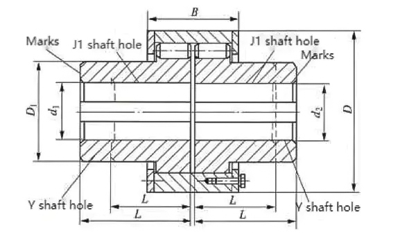 | Typ | Nenndrehmoment /N·m | Zulässige Geschwindigkeit [n]/r·min⁻¹ | Schaftlochdurchmesser d₁,d₂ | Schaftlochlänge | D | D₁ | B | S | Trägheitsmoment /kg·m² | Masse m/kg | |